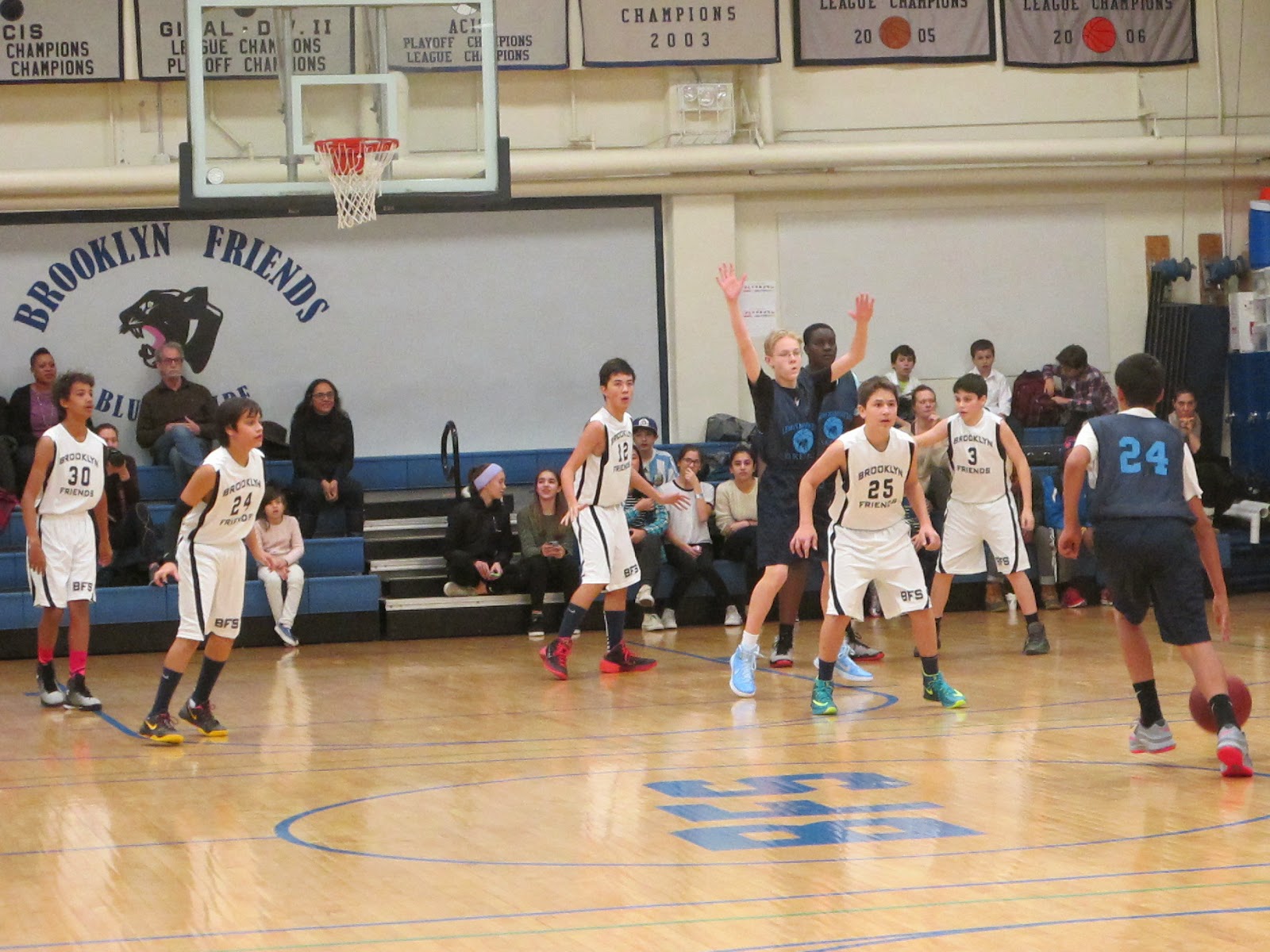On Monday the BFS MS Boys Basketball Team defeated Friends Seminary 48-45 on the road. The team notched their second win of the season against the fellow Quaker School in dramatic fashion with the three point victory. The team was led offensively by eighth grader Kwesi C-S with 13 points. Kwesi also helped out on the boards with 13 rebounds but was second on the team in the category as fellow eighth grader Luca J. pulled down a career high and team best 15 rebounds to go along with his 6 points. Seventh grader Ty S. once again came off the bench to provide big minutes scoring 7 points, picking up 2 assists, and gabbing a rebound. Through the first four games Ty leads the team in scoring at just under 8 points per game. Nearly everyone who played scored. Cailean M. (8th) had 5 pts., Miles J-P (8th), Lewis and Ryan (7th) had 4 pts., and Daniel D. (8th) chipped in with three pts.. Aja M. (7th) had two points while grabbing 9 rebounds. The trio of Aja, Kwesi and Luca accounted for 37 of the team’s 41 rebounds. Blue Pride Runs Deep, Friends Forever!!